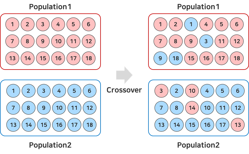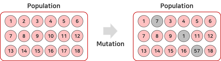 교차는 population들이 일부를 서로 교환하는 방식으로 진행됩니다. 교차를 통해 새로운 population을 만들어내면서 최적값을 찾아가는 것이죠. 하지만, 이런 교차를 통해서 얻을 수 있는 population은 초기의 population의 구성에 의존할 수 밖에 없습니다. 다시 말해 구성 변화의 범주가 고정되어 있어 완전히 새로운 구성의 population을 얻는데 한계가 발생합니다.